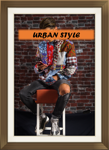 Jongen in een jas met capuchon in Urban style. De anorak is uitgevoerd in patchwork. Dat wil zeggen dat de jas bestaat uit allemaal verschillende kleuren lapjes, die eerst aan elkaar zijn gezet.